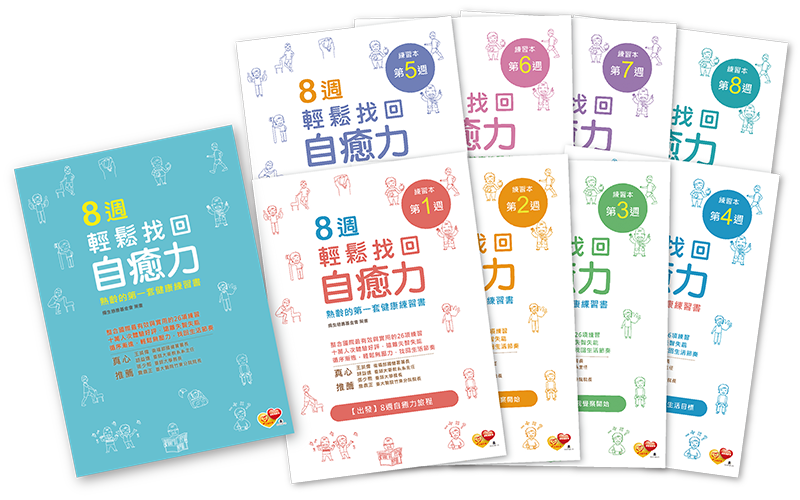 搭配專為熟齡開發的健康套書《8週∙輕鬆找回自癒力》──摘要56天循序漸進的27項自主練習精華,輔以每週建立個人健康目標,將自癒力與3+1行動融入每天的生活,並透過團體討論與支持,輕鬆無壓力的自主練習,讓健康生活更容易,一起找回生命的活力自主權。