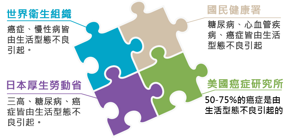 世界衛生組織、美國癌症研究院、日本厚生勞動省及臺灣國健署,都說50%-75%的慢性病是來自於生活型態不良,而且是長期累積的生活形態不良所引起的。而生活型態是自己可以決定的,那我們是不是就有機會能掌握這50%-75%的罹病率了呢?